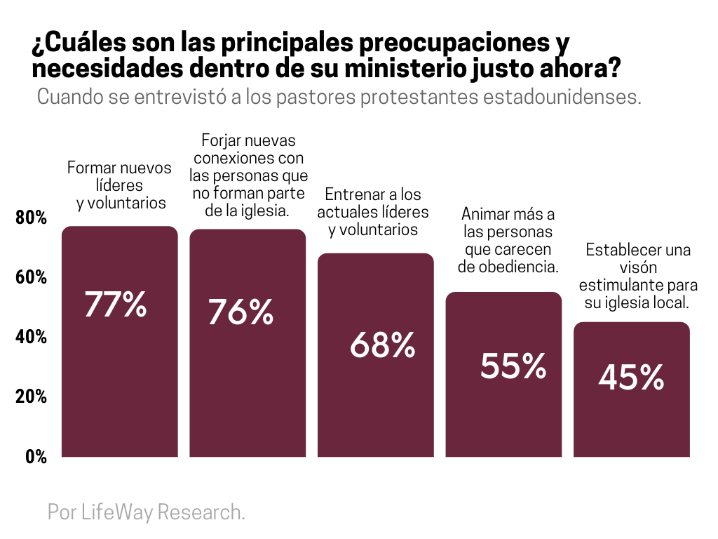 De acuerdo a la última publicación de LifeWay Research 2022, el estudio sobre las necesidades y preocupaciones más grandes de los pastores, los pastores protestantes estadounidenses dicen que desarrollar líderes y conectar con las personas que no están involucradas en la vida de la iglesia son sus dos necesidades más prominentes en el ministerio.