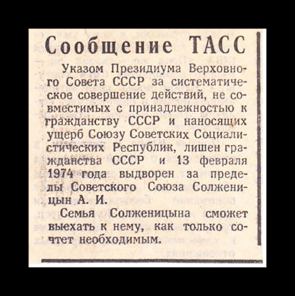 Informe TASS de 1974 sobre la expulsión de A. Solzhenitsyn.