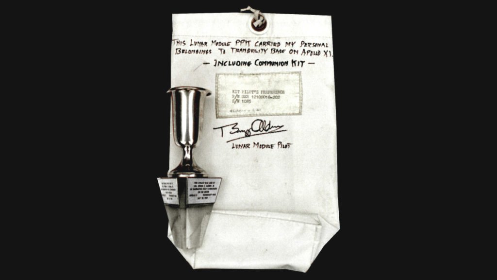 Pero, unos minutos antes, el piloto del módulo lunar Buzz Aldrin hizo una petición especial, pues había traído entre sus pertenencias. un juego diminuto de comunión, que le había dado su iglesia. Tenía un cáliz de plata y un frasquito de vino cerca del tamaño de la punta de su dedo. Durante la mañana él transmitió por radio: