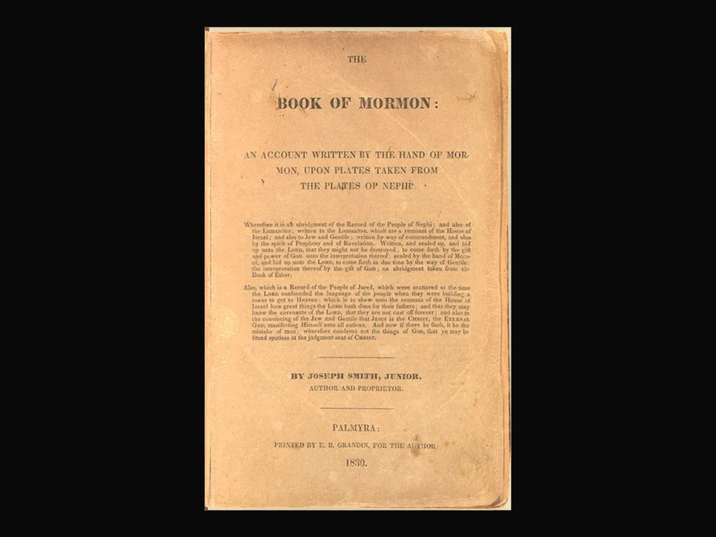 Tres años después, en 1823, Smith describió una “segunda visión”, en la cual un ángel llamado Moroni le reveló la existencia de unas escrituras ocultas hechas de planchas de oro, que él tradujo en el Libro del Mormón. Publicado en 1830, este texto, junto con la Biblia, se convirtió en la piedra angular de las escrituras del incipiente movimiento, así como también la “carta de presentación de Joseph Smith al mundo”. Escrito en el inglés del estilo de la Biblia King James, este libro relataba la historia perdida de los israelitas que navegaron hacia América tras el exilio babilónico y cuyos descendientes en los últimos días fueron visitados nada menos que por Jesucristo mismo después de Su resurrección.