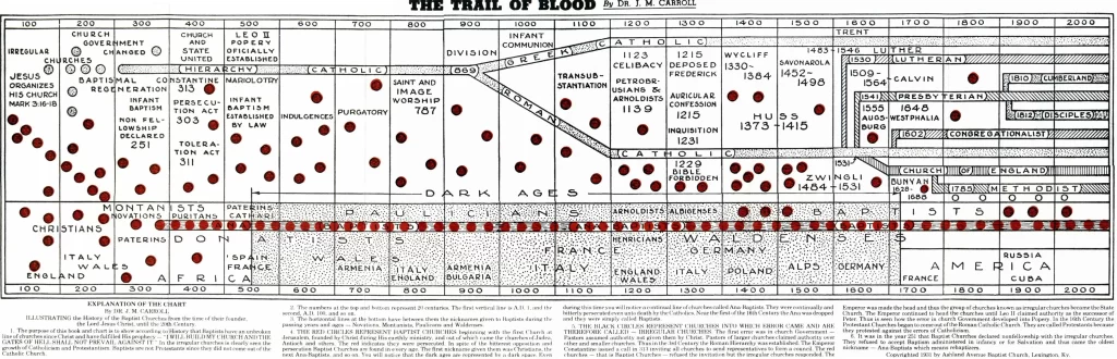 Con él, Carroll quería argumentar que los bautistas han existido desde los tiempos de Cristo hasta nuestros días y que su subsistencia se puede demostrar en una cronología ininterrumpida. Este muestra una línea de tiempo desde el año 100 hasta el 2000. Los dos bloques del centro representan las dos grandes divisiones que existieron, según Carroll, entre la línea principal del cristianismo, y la línea marginal, que representa al movimiento en cuestión.