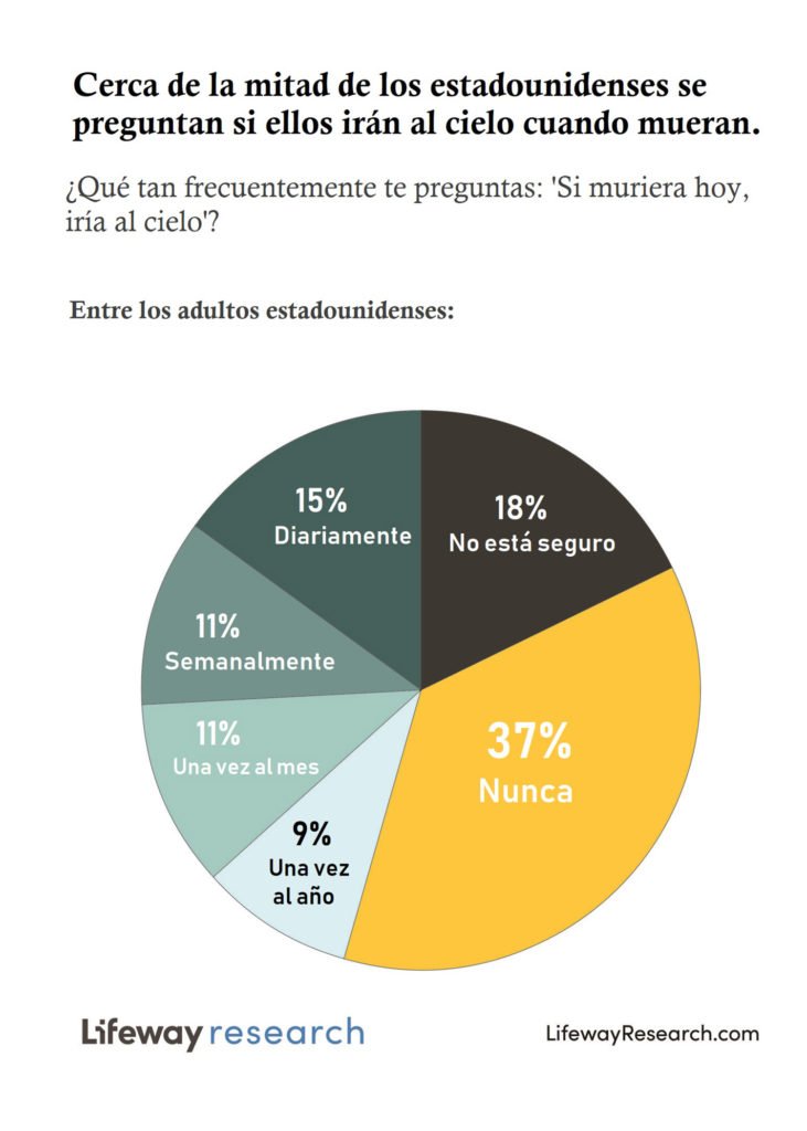 Cerca de la mitad de los estadounidenses (45%) dicen que se preguntan: “Si muriera hoy, ¿estoy seguro de que iría al cielo?” Más de un tercio (37%) dice que nunca piensa en esa pregunta y el 18% no está seguro de que tanto piensa en esto durante su vida diaria.