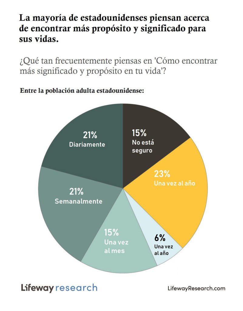 En comparación con un estudio de Lifeway Research de 2011, los estadounidenses de hoy son más propensos a pensar regularmente en cómo pueden encontrar más significado y propósito en sus vidas. Hace una década, el 51% dijo que se preguntaba sobre cómo encontrar un significado y propósito al menos una vez al mes, mientras que el 18% dijo que pensaba en ello a diario y el 19% dijo que lo pensaba semanalmente. El trece por ciento dijo que pensaba en esa pregunta anualmente y el 28% dijo que nunca la consideraba.