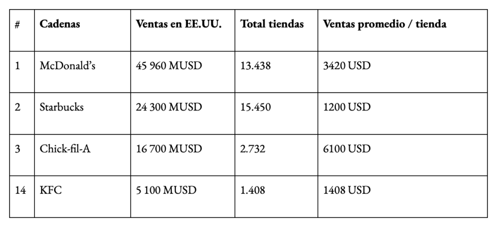 El “milagro” se evidencia en la lista de las 50 mejores cadenas de comida rápida (también de QSR), ordenadas según sus ventas totales en todo Estados Unidos durante el 2021. Allí, Chick-fil-A aparece en la tercera posición, con un ingreso de 16 700 MUSD, superada por dos gigantes como Starbucks y McDonald’s. Mientras tanto, KFC aparece en la posición 14 con 5 100 USD. Es decir, la empresa cuenta con más ventas promedio por tienda a pesar de que solo abre seis días a la semana, decisión que prácticamente hace parte de su marca. Además, en 2017 recogió 9 000 MUSD en las 2225 sedes que tenía, lo cual significa un aumento de 85,5% en sus ingresos.