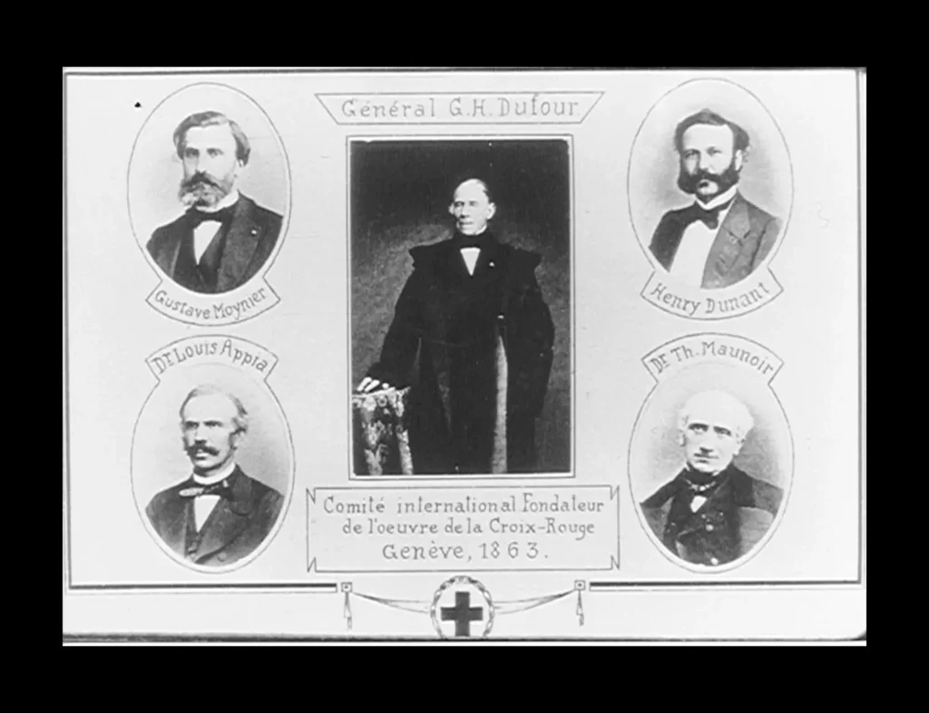 Este comité, conocido como el “Comité de los Cinco”, estaba compuesto por Dunant, Moynier, el general suizo Henri Dufour, y los doctores Théodore Maunoir y Louis Appia. Este último consideró que se necesitaba un símbolo para identificar a aquellos grupos neutrales que se encargarían de humanizar la guerra, así que propuso una cruz roja con un fondo blanco (lo contrario a la bandera Suiza). Así, el 17 de febrero de 1863, día en el que tuvieron su primera reunión, se considera la fecha en la que se fundó el Comité Internacional de la Cruz Roja.