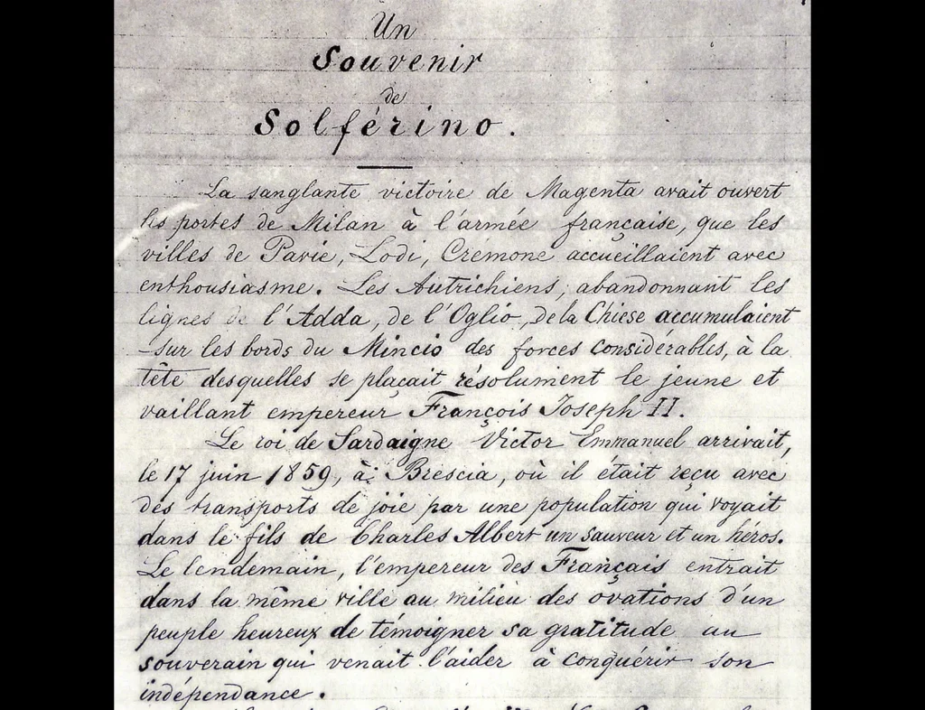 Tras regresar a Ginebra a principios de julio, Dunant decidió escribir un libro sobre su experiencia. Se trata de Un Souvenir de Solferino (Un recuerdo de Solferino), que fue publicado en 1862 a su propio costo. En él describió la batalla y sus secuelas caóticas, y presentó dos ideas clave: la necesidad de fundar sociedades de socorro en tiempo de paz para asistir a los heridos en la guerra con voluntarios calificados, y la propuesta de un principio internacional —sancionado por una convención— que sirviera de base para estas sociedades. Esta obra transformó para siempre la percepción de la humanidad respecto a los daños ocurridos durante la guerra.