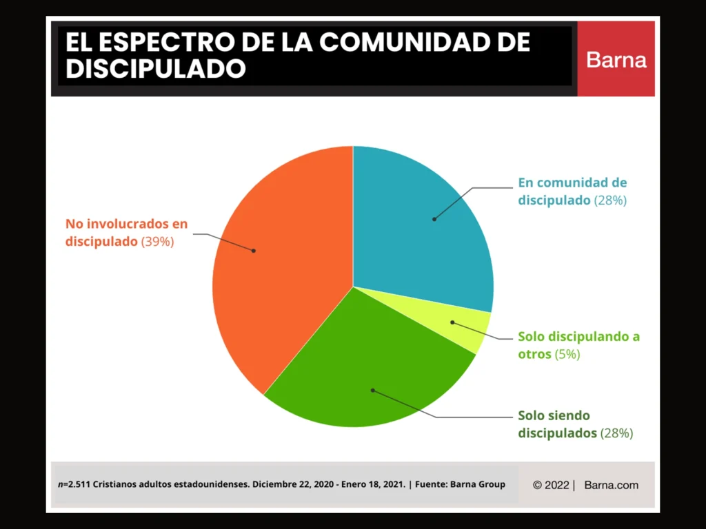 A partir de esta caracterización, encontraron que solo un poco más de uno de cada cuatro cristianos estadounidenses (28%) se encuentra en esta categoría de “comunidad de discipulado”. Otro 28% está siendo discipulado, pero no está ayudando a otros a acercarse más a Cristo, y un porcentaje muy pequeño (5%) solo está discipulando a otros. Esto nos deja con la elevada cifra de 39% de cristianos que no están involucrados en el discipulado, es decir, no están enseñando a otros ni siendo enseñados.