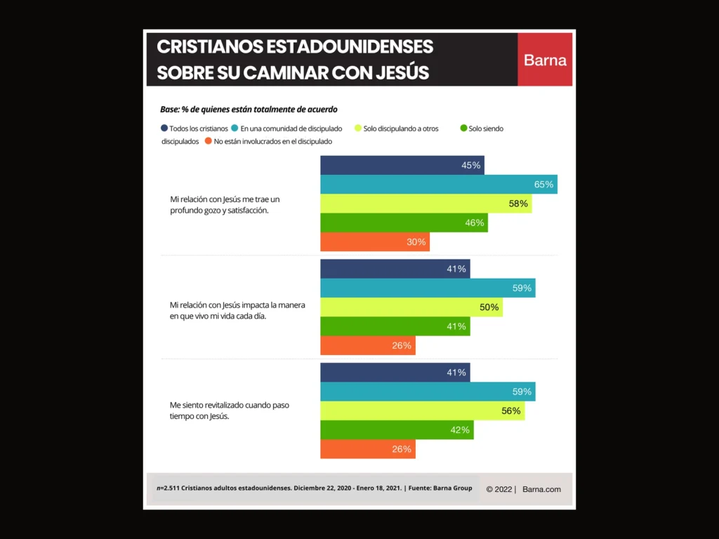 Barna también indagó acerca de las motivaciones de los creyentes para involucrarse en el discipulado. Cuando se trata de discipular a otros, las principales motivaciones encontradas en las encuestas incluyen “acercarse más a Dios” y “desarrollar aún más su fe”. De manera alentadora, este estudio revela que ese es exactamente el resultado que muchos cristianos están experimentando. Las cifras muestran que quienes están en una “comunidad de discipulado” tienen más probabilidades de sentirse revitalizados por el tiempo que pasan con Jesús y de obtener un profundo gozo y satisfacción por su relación con Él.