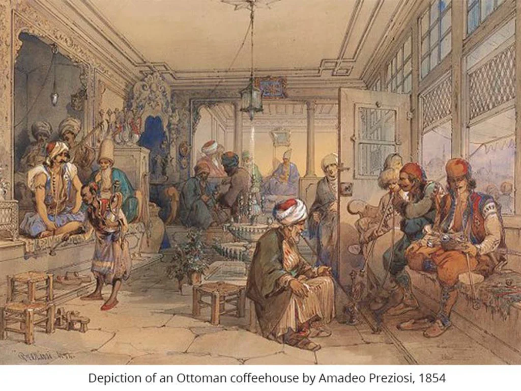 La presencia del café en el Cercano Oriente era habitual; las primeras cafeterías de la historia se abrieron bajo el nombre “kahvehane”, que significa “cafetería otomana”. Para el siglo XV, el café fue introducido en el mundo islámico por peregrinos musulmanes. Los líderes políticos no pudieron detener su popularidad mientras se extendía por Persia, Egipto, Turquía y el norte de África. El café era tan popular en la cultura que las mujeres turcas podían divorciarse de sus maridos si no les proporcionaban una cantidad suficiente. Fuentes antiguas señalan que en La Meca, en el siglo XVI, había más de 600 cafeterías en Constantinopla (hoy Estambul), que se usaban como centros de tertulia y artes.