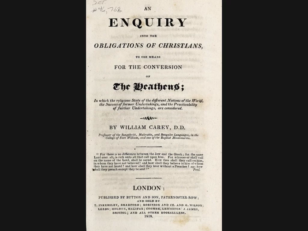 En una reunión de pastores de Northamptonshire, en junio de 1791, los pastores Andrew Fuller y John Sutcliff predicaron poderosos mensajes sobre el “espíritu dilatorio” de la época y el ferviente celo evangelizador que debería acompañar a las buenas nuevas del evangelio. Al concluir la reunión, se pidió a Carey que abordara por escrito la pregunta para la que ya conocían la respuesta de las Escrituras: si era posible o no que los cristianos predicaran la Buena Noticia en las naciones no alcanzadas, así como si existía el deber de hacerlo. Su panfleto, An Enquiry, fue publicado más tarde, ese mismo año.