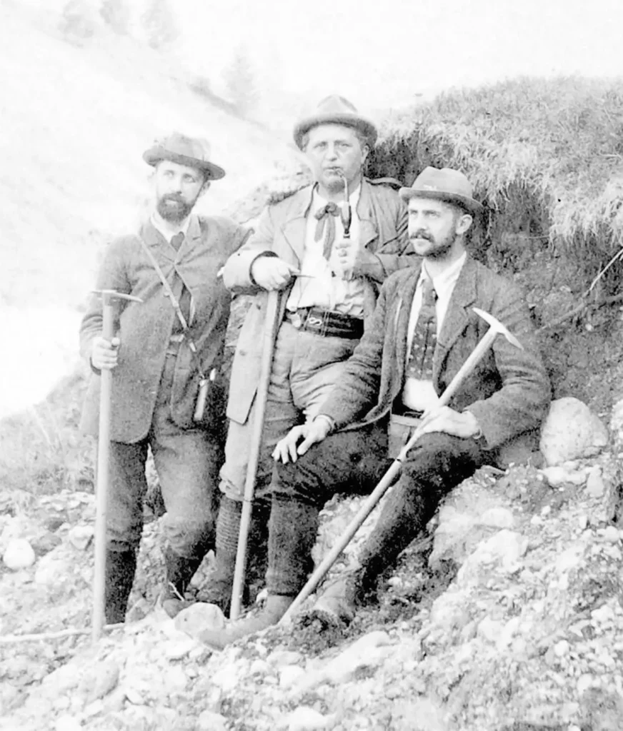 La otra fotografía muestra a un hombre de mediana edad, vestido de traje tirolés, su pipa en mano, esperando tranquilamente por el fotógrafo, de pie en medio de sus hijos Herman y Abraham Jr., también con algún tipo de equipo de montaña.
