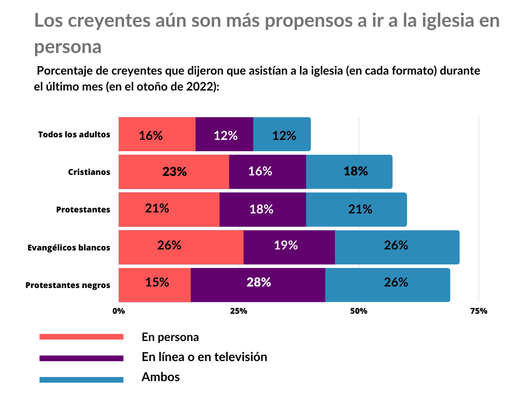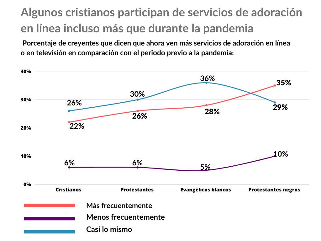 En cuanto a las iglesias en general, la participación en los servicios en línea no es tan alta como durante los confinamientos. Sin embargo, el 22 % de los cristianos dicen que ven transmisiones de ese tipo de manera más frecuente que antes de la pandemia, según un estudio publicado recientemente por el Pew Research Center. El centro de investigaciones encontró que el porcentaje general de estadounidenses que van a la iglesia en persona y de manera regular ha caído ligeramente. Además, la demografía de las personas con más probabilidades de asistir a la iglesia antes de la pandemia vio una caída significativa, el porcentaje de los evangélicos blancos disminuyó 5 puntos entre 2019 y 2022, mientras que el de los protestantes afromaericanos decayó en un 15 % en el mismo periodo.