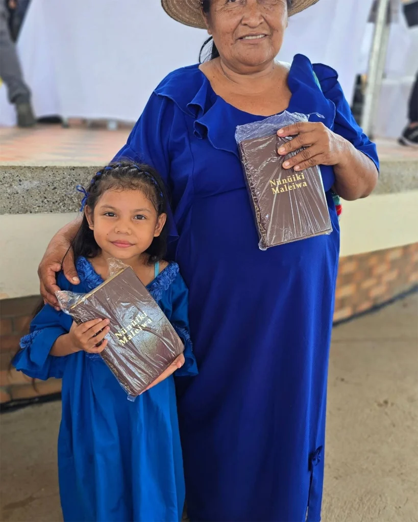 La ingeniera estaba lo suficientemente cerca como para saber que le estaba contando a alguien lo que la tenía tan feliz, pero no tanto como para poder distinguir lo que decía. Estaba tan absorta en la imagen de la mujer alegre, que tardó en darse cuenta de que varios miembros de aquel grupo indígena –el más grande de Colombia– venían detrás de la mujer también con una sonrisa. Llevaban en sus manos un libro color tierra abrazado, como si fuera un valioso tesoro. Pronto pudo distinguir con sus oídos algunas palabras que dijo la wayú en español: “¡Esto es maravilloso y todavía no puedo entenderlo! ¡Por fin la tengo! No sabes cuánto quería tener la Biblia en mis manos”. En la portada se leía: Nünüiki Maleiwa (en español, Palabra de Dios).
