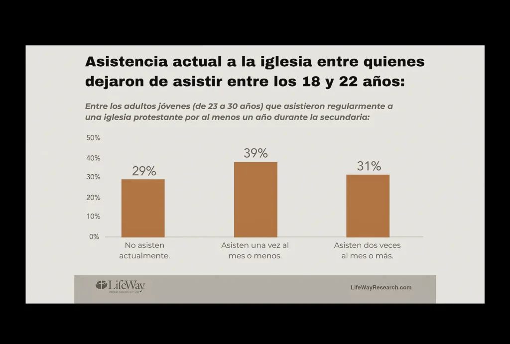 Entre quienes se alejaron por al menos un año, el 31% actualmente asiste dos veces al mes o más. “En cierto sentido, es alentador saber que algunos regresan”, dijo Trueblood. “Pero al mismo tiempo, debemos reconocer que cuando alguien se aleja en esos años, hay un 69% de probabilidad de que no regrese”.