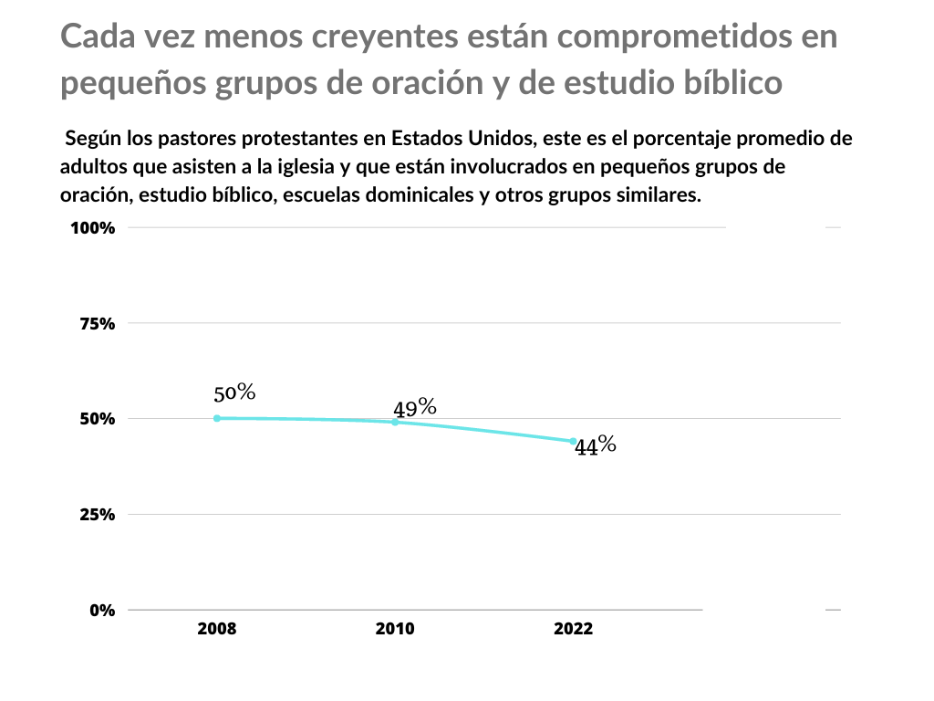 En particular, las iglesias pequeñas enfrentan desafíos significativos cuando se trata de integrar a los asistentes de los cultos dominicales a grupos más reducidos. El 39 % de las comunidades con menos de 50 congregantes tienden a decir que menos del 25 % de sus miembros están involucrados en los grupos.