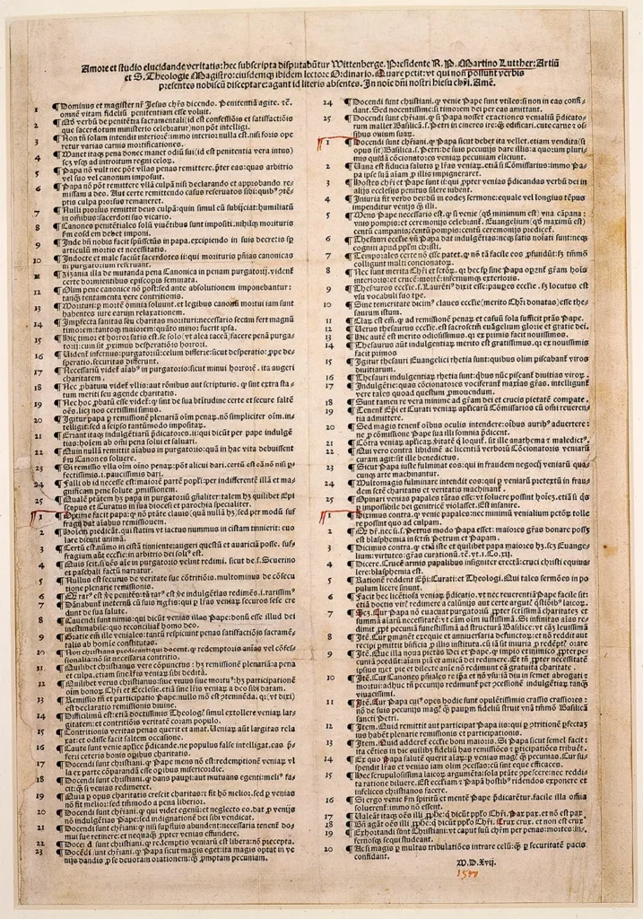 En 1517 las implicaciones de su peregrinaje teológico se cristalizan en dos series de Tesis. Las 97 Tesis de septiembre de 1517 y las famosas 95 Tesis de octubre de 1517. En ambos casos se trata de tesis que Lutero, como decano de la Facultad de Teología de la Universidad de Wittenberg, elabora para que un estudiante las defienda en disputación pública. Las 95 Tesis sobre las indulgencias profundizan en las implicaciones teológicas y pastorales de la promulgación y venta de indulgencias papales que se están realizando en ese momento, mientras que las 97 Tesis se presentan como una Disputación en contra de la teología escolástica. Estas Tesis sobre la teología escolástica mencionan por nombre solo a Duns Escoto y Guillermo de Ocam, con sus seguidores Pierre d’Ailly (nombrado sencillamente como “el cardenal”) y Gabriel Biel, pero el título abarca a todos los teólogos escolásticos.