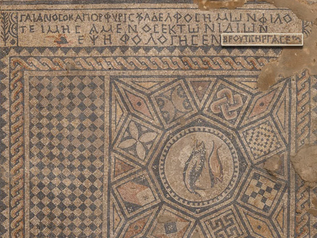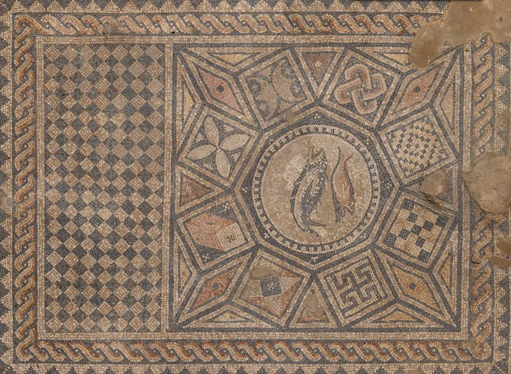 La imagen más notoria del mosaico es la de dos peces, que desde muy temprano en la historia representaban el cristianismo, tanto por el acrónimo griego ἰχθύς (ikhthýs), cuyas letras significaban “Jesús”, “Cristo”, “de Dios”, “Hijo” y “Salvador”, como por el famoso relato de la multiplicación de los panes y los peces. Esta imagen nos dice mucho: al no haber representaciones de personas ni de dioses romanos, es evidente que su propósito era la adoración cristiana.