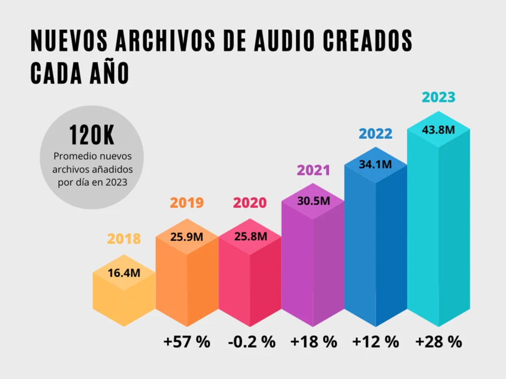 Actualmente, según Music Business Worldwide, “se graba y se publica más música que en ningún otro momento de la historia de la humanidad”. Desde el 2018 hasta el 2023, hubo un aumento del 167 % en la cantidad de contenidos publicados en plataformas de streaming. En el primer trimestre de 2023, a diario se añadieron en promedio 120 000 audios musicales. Es decir, se estima que al finalizar el año pasado se subieron casi 44 millones de canciones a Spotify, YouTube Music y otros servicios de música. Para hacernos una idea de lo que esto significa, si cada una de esas 44 millones de canciones tuviera una duración de cuatro minutos, serían necesarios más de 334 años para escucharlas todas.