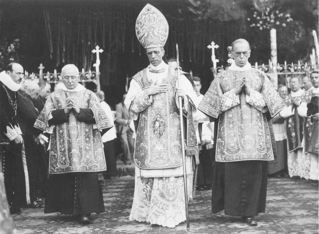 Ella, pues, Madre santísima de todos los miembros de Cristo, a cuyo Corazón Inmaculado hemos consagrado confiadamente todos los hombres, la que ahora brilla en el cielo por la gloria de su cuerpo y de su alma, y reina juntamente con su Hijo, obtenga de Él con su apremiante intercesión que de la excelsa Cabeza desciendan sin interrupción —sobre todos los miembros del Cuerpo Místico— copiosos raudales de gracias; y con su eficacísimo patrocinio, como en tiempos pasados, proteja también ahora a la Iglesia, y que, por fin, para esta y para todo el género humano, alcance tiempos más tranquilos.