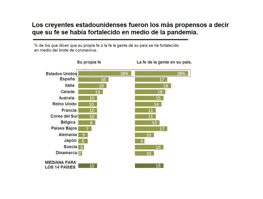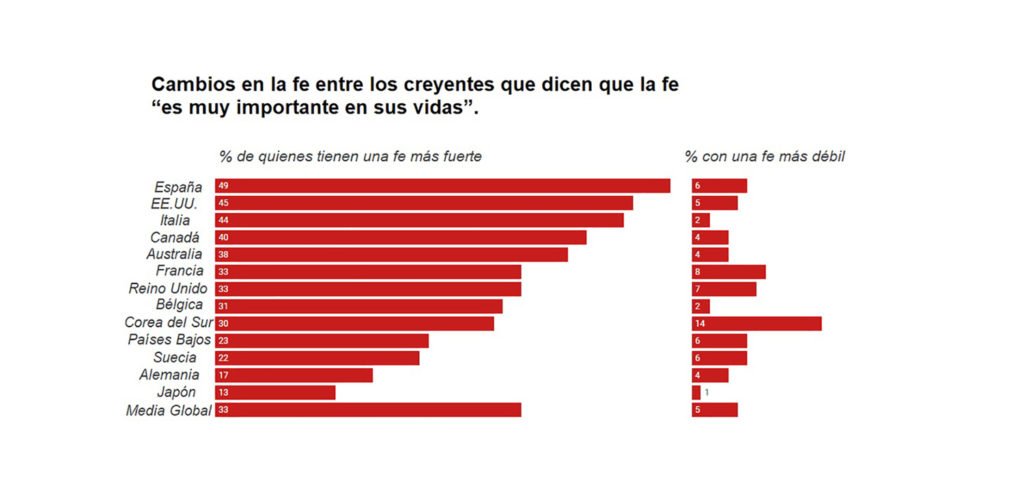 Sin embargo, entre los encuestados que dijeron que la religión era “muy importante” en sus vidas, una proporción mucho mayor informó que su fe se fortaleció. Esto incluyó al 49 por ciento de los españoles creyentes, el 45 por ciento de los estadounidenses, el 44 por ciento de los italianos y el 40 por ciento de los canadienses. A nivel mundial la media de quienes reportan que su fe es muy importante es del 33%.