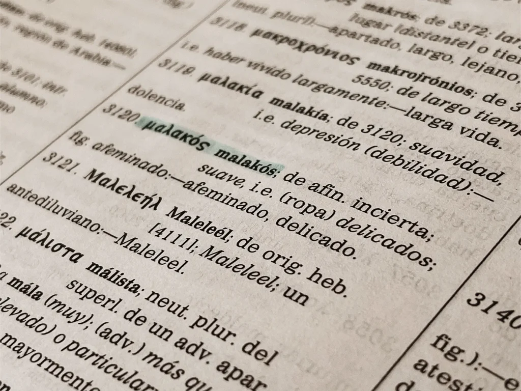 Ni malakos ni tryphē llevan la asociación lingüística con el sexo femenino que tiene la palabra castellana “afeminamiento”. Esto podría considerarse un punto fuerte, ya que permite a los cristianos contemporáneos debatir la cuestión moral sin verse arrastrados inmediatamente a una discusión sobre los sexos. Pero el Nuevo Testamento sí utiliza una palabra que se opone a malakos, y esta palabra sí conlleva una asociación con el sexo de una persona.