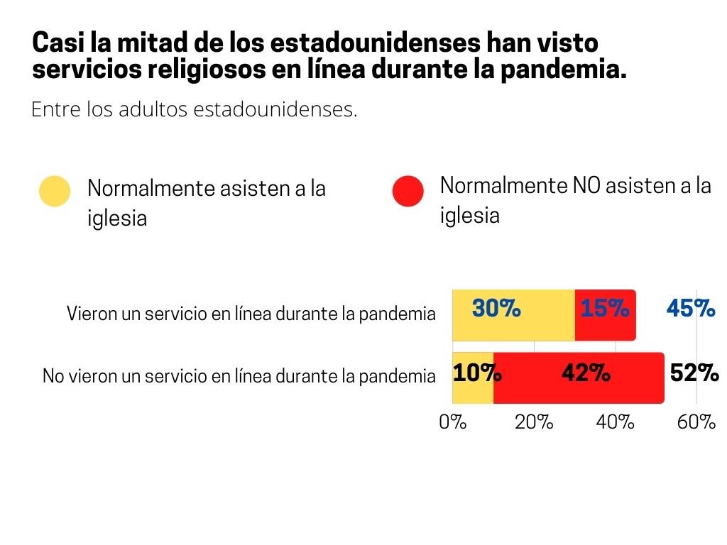 En este contexto, el más reciente estudio conducido por LifeWay Research, la organización evangélica de estudio demográfico basada en Nashville, afirma que cerca del 45% de los estadounidenses han informado que ellos han visto servicios religiosos en línea durante la pandemia, incluyendo a algunos que dicen que ellos normalmente no asistían a la iglesia. Alrededor de la mitad de los encuestados (52%) dicen que ellos no han visto servicios religiosos en línea durante la pandemia, la mayoría de los cuales afirman que ellos normalmente no asistirían a un servicio religioso de cualquier modo.