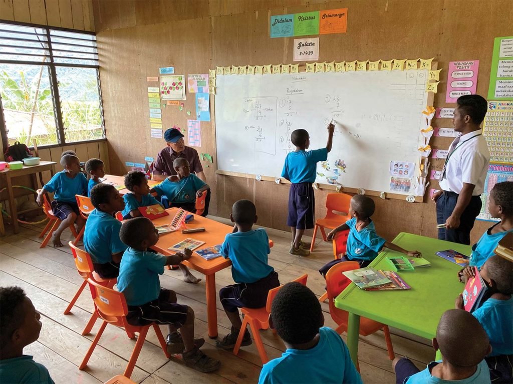 El fundador de YPHP, James Riady, se une a los estudiantes de Mek en Nalca para una clase de matemáticas / Foto: Jeremy Weber